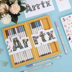 Оригінальний дизайн упаковки для набору 20 металевих маркерів: двостороння коробка для 2 типів металевих ручок, 10 ручок з тонким наконечником і 10 ручок з наконечниками пензликами, ви можете легко підібрати необхідну вам ручку. Металеві маркери пензлі також ідеально підходять для тонкої каліграфії.