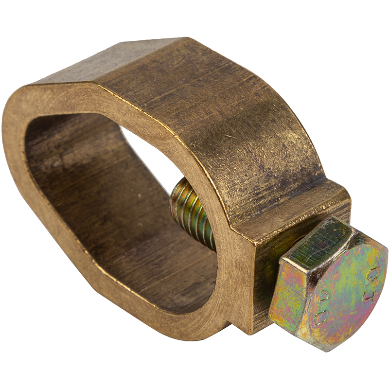 Затискач заземлення з фіксуючим гвинтом, виготовлений з латуні. Різьба болта 25 мм, шестигранна головка 14 мм. Клас міцності болта 4.8.