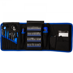 Набір включає: біти для викрутки та дві ручки для викрутки, чорну портативну тканинну сумку для інструментів, антистатичний браслет, вигнутий пінцет, 5 пластикових інструментів для підмикання, 1 металевий інструмент для підмикання, 1 гнучкий інструмент для підмикання, щітку для чищення, 8 пластикових трикутних щіток для відмикання (для розділення частин пристрою без подряпин), гнучкий подовжувач викрутки довжиною 127 мм, гумову присоску з кільцем (для зняття екрана), штифт для вилучення SIM-картки, інструмент для намагнічування/розмагнічування, тканину для чищення та магнітну накладку для гвинтів.