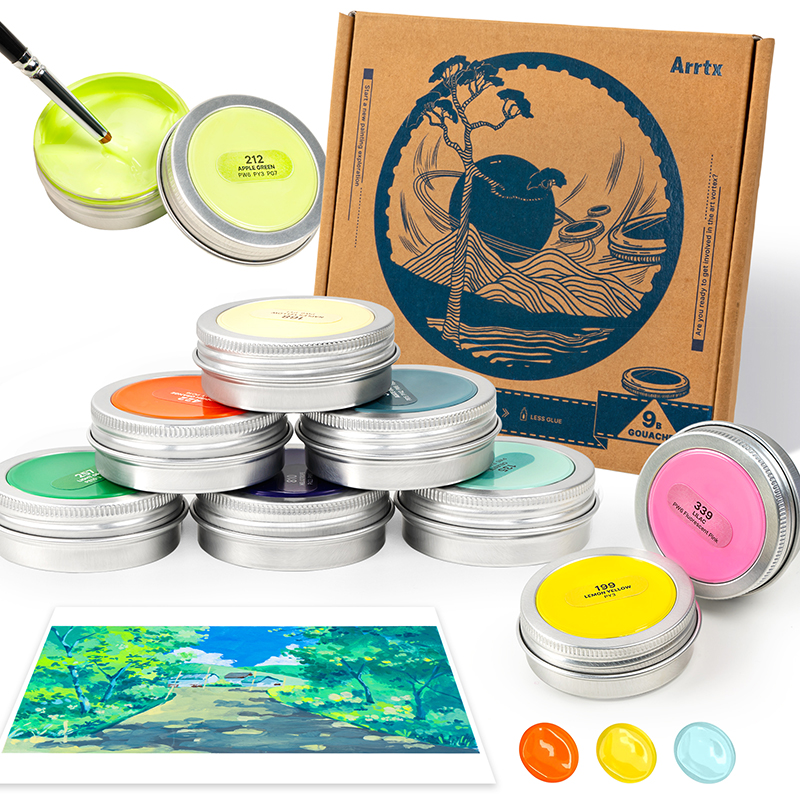 Високоякісна пігментна гуаш Arrtx, 9 кольорів. Набір підходить як для професійного, так і для аматорського використання. Удосконалено формулу фарби Arrtx, у цій гуаші менше клею, чистіші пігменти, більш насичені кольори, менше запаху. Коли картина висохне, вона не потріскається, а фарби залишаться яскравими і не потьмяніють довгий час. Фарби нескладно розбавити, але вони не втратять своєї покриваності навіть за відносно низької в'язкості. Після висихання має гладкий вигляд із матовим ефектом. Баночки для гуаші виготовлені з легкого алюмінію, тому набір зручно носити з собою, а баночки можна використовувати повторно.